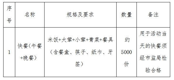 1、主要內(nèi)容:合作供應商在徒步當天,負責為佛山五區(qū)參與徒步的相關(guān)工作人員提供飯餐服務(wù),詳細需求如下(以下數(shù)據(jù)供參考):